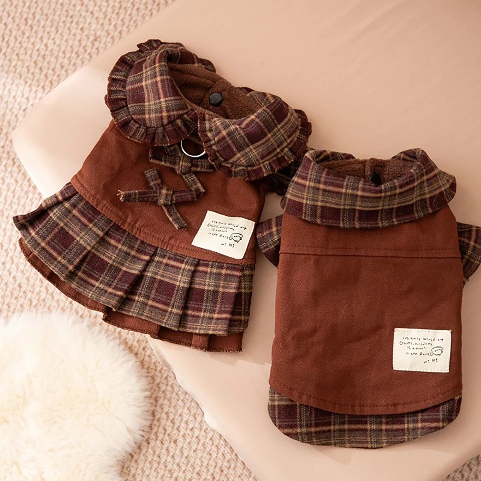 New autumn and winter dog clothes- Maillard Checkered Couple Outfits- Teddy Dresses- Dog Hoodies.